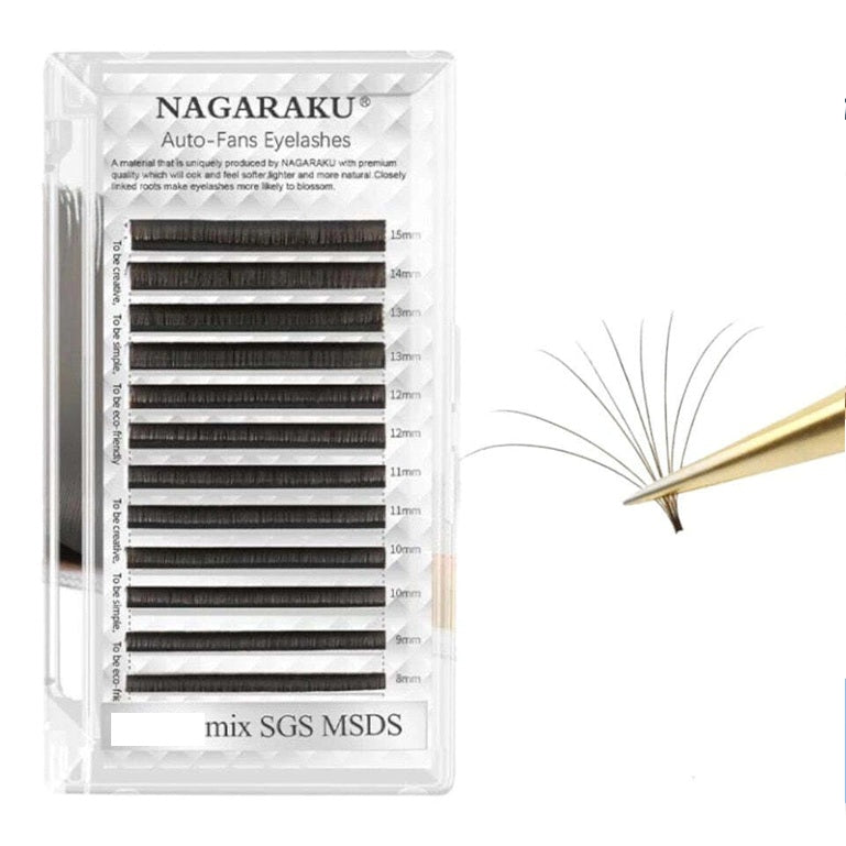 Lleva tu trabajo al siguiente nivel con las pestañas auto-fans de Nagaraku: abanicos pre-formados que ahorran tiempo, se aplican fácil y crean un volumen uniforme y profesional en cada set.